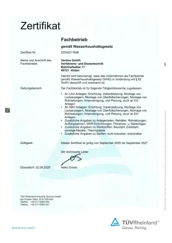 Unser Unternehmen ist ein anerkannter, WHG geprüfter Fachbetrieb, dessen Verantwortliche regelmäßig entsprechend geschult und geprüft werden.